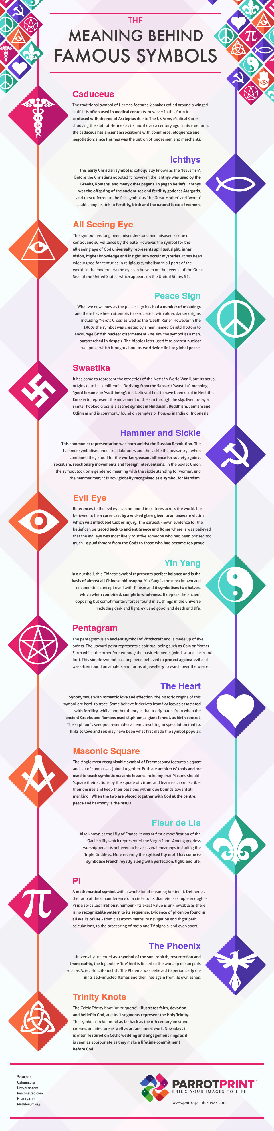 But remember, when using famous symbols and other iconic imagery, make sure that your understanding of their meaning is accurate, to avoid misrepresentation. Parrot Print Canvas created an infographic that illustrates some of the world’s most recognizable symbols and the meaning behind them.