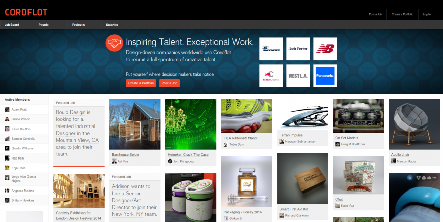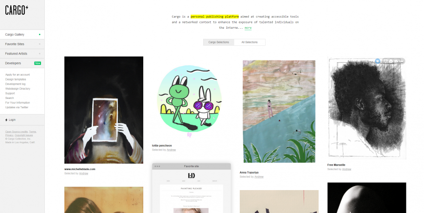 Cargo Collective offers free-standing websites with fully-customizable design templates, as well as easy to navigate back-end maintenance and a sophisticated built-in user interface. When it comes to the works it publishes, Cargo Collective has a high standard for quality; hence membership is by invite only. Artists may apply for an account, but the site also awards memberships to those who will share samples of their work. - Coroflot